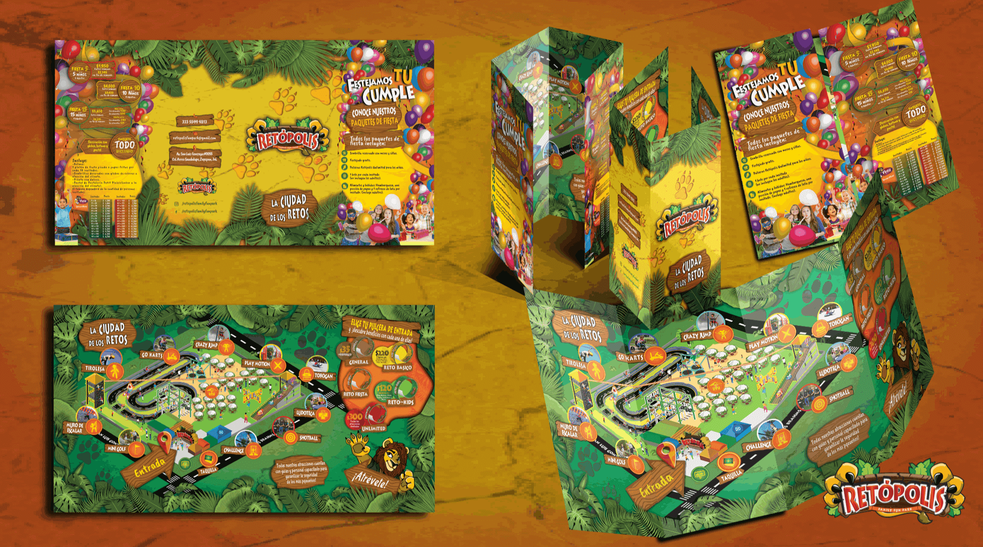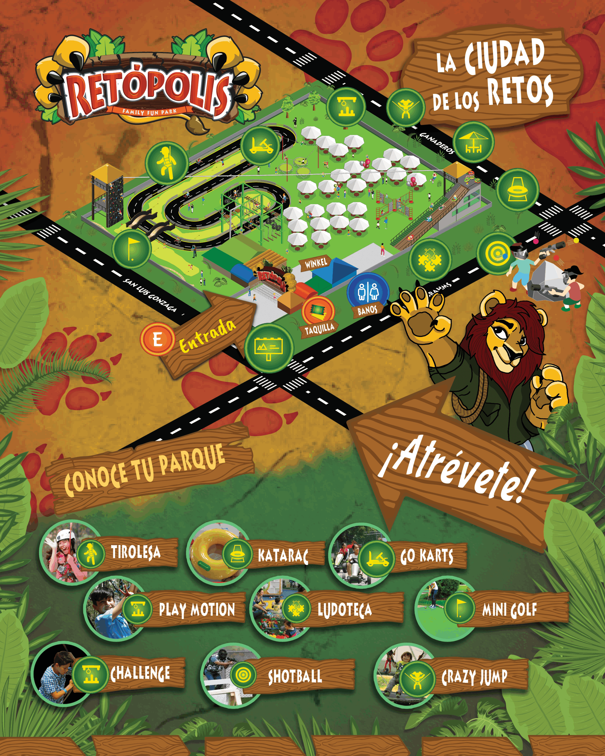 The concept was clear at the start: it had to include a lion, a jungle, fun typhographic management and a colorful display that ensured the complete experience. Direct competition in this comertial sector has some assets that may be explored and analyzed for this project to have its own identity and exposure to the new market. Since the park was to be located inside the Guadalajara metropolitan zone (not an usual place, to be honest), people would gain interest beacause of factors such as the time to arrive.